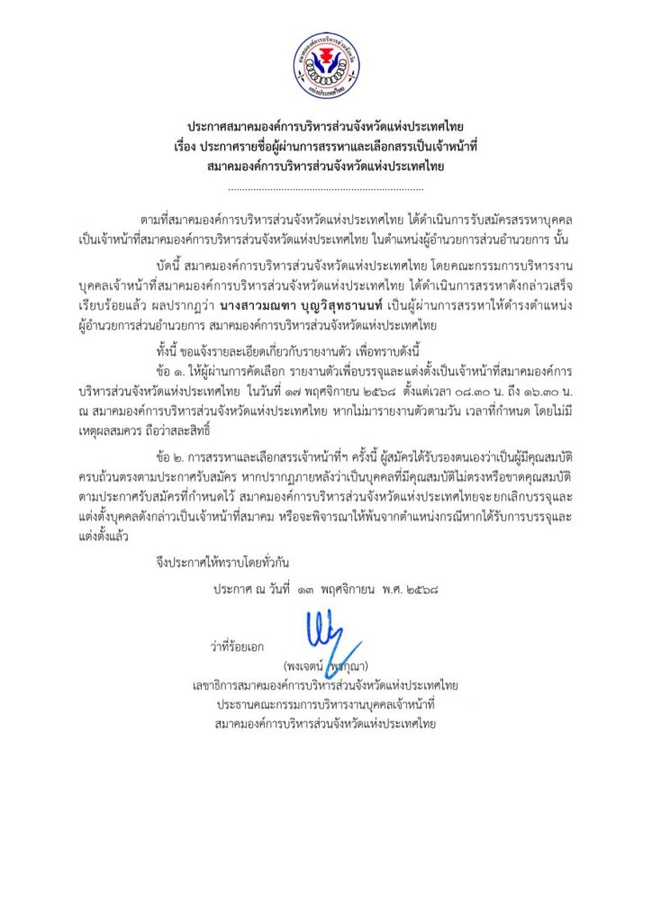 ข่าวประชาสัมพันธ์ ประกาศรายชื่อผู้ผ่านการสรรหาและเลือกสรรเป็นเจ้าหน้าที่สมาคมองค์การบริหารส่วนจังหวัดแห่งประเทศไทย พฤศจิกายน 13, 2025พฤศจิกายน 13, 2025 admin 0 Comments